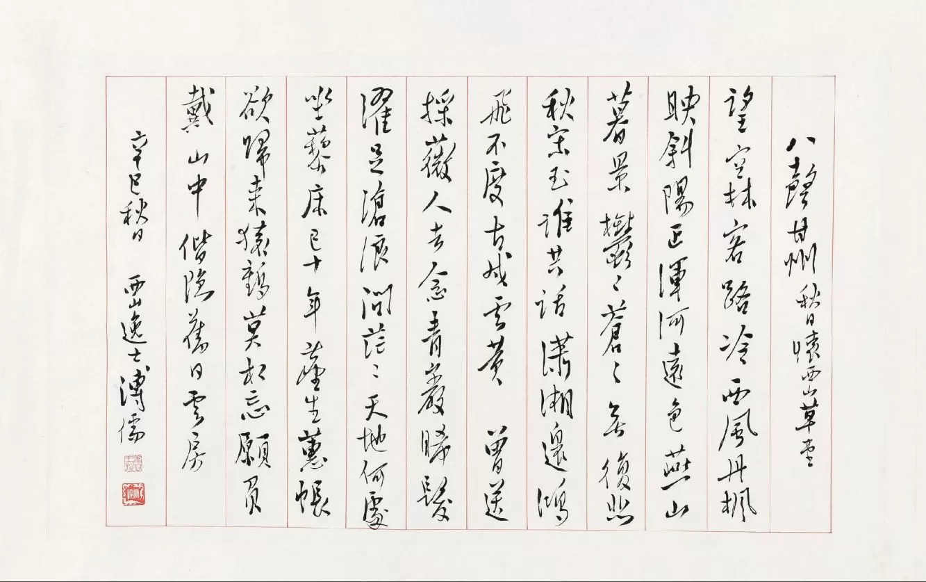款识:八声甘州,秋日怀西山草堂。望空林,客路冷西风,丹枫映斜阳。正浑河远色,燕山暮景,郁郁苍苍。无复悲秋宋玉,谁共话潇湘。遥鸿飞不渡,古戍云黄。曾送采薇人去,念青岩晞发,濯足沧浪。问茫茫天地,何处藜床。三十年、尘生蕙帐,欲归来、猿鹤莫相忘。愿戴负、山中偕隐,旧日云房。辛巳秋日,西山逸士,溥儒。