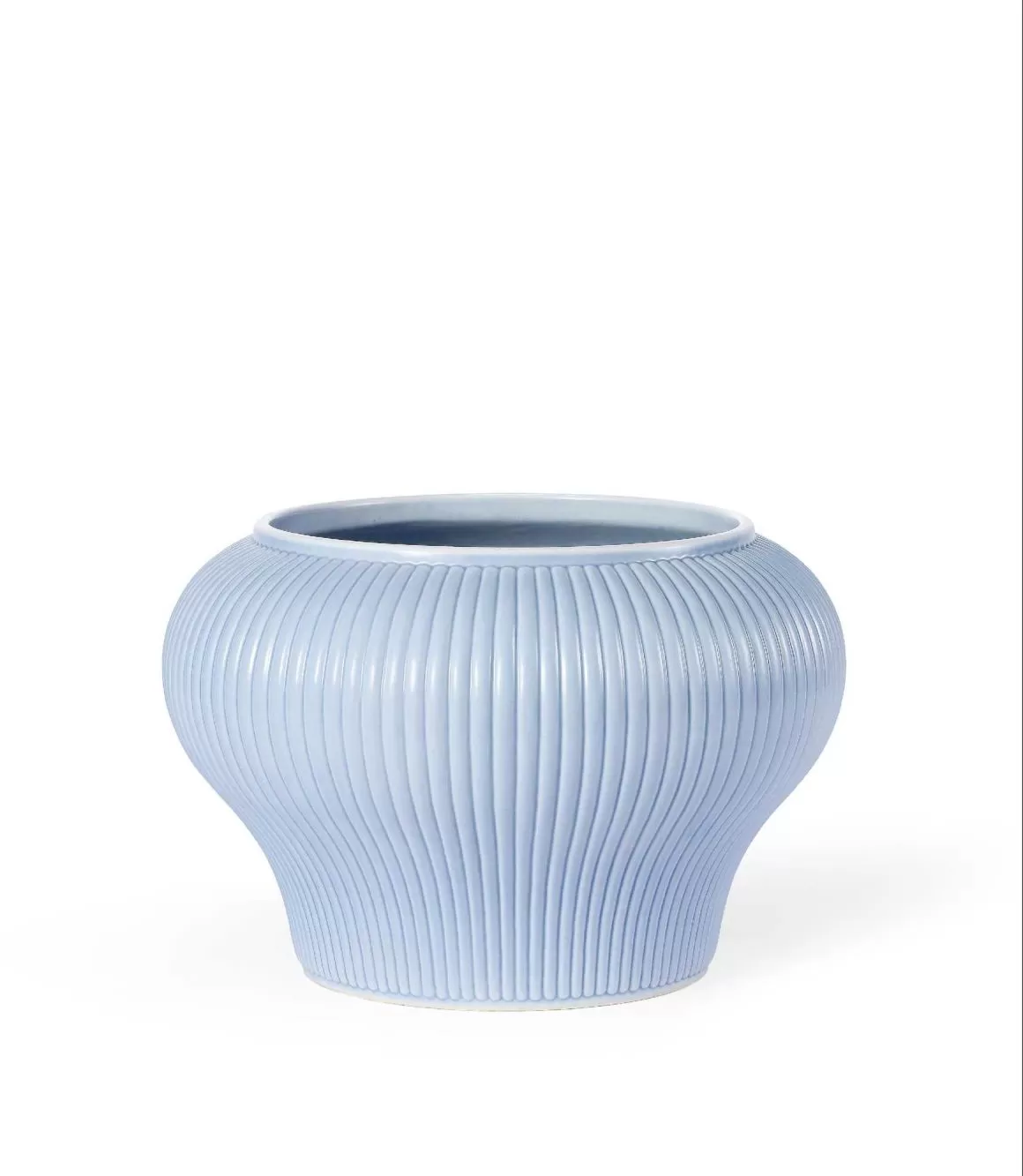 此器缩颈,直唇,鼓肩,腹下部急收至底,器形端庄稳健,流丽优雅。器身装饰直棱柳条纹,均匀分布,恰为一百根,故而得名百条缸。器内外施天蓝釉,釉色洁净清淡,温润隽永,釉色与形制搭配相宜,但见自上而下的线条在釉水中自然流畅,疏密随视线移动而不断变换,恬淡不失灵动,令人心旷神怡。
