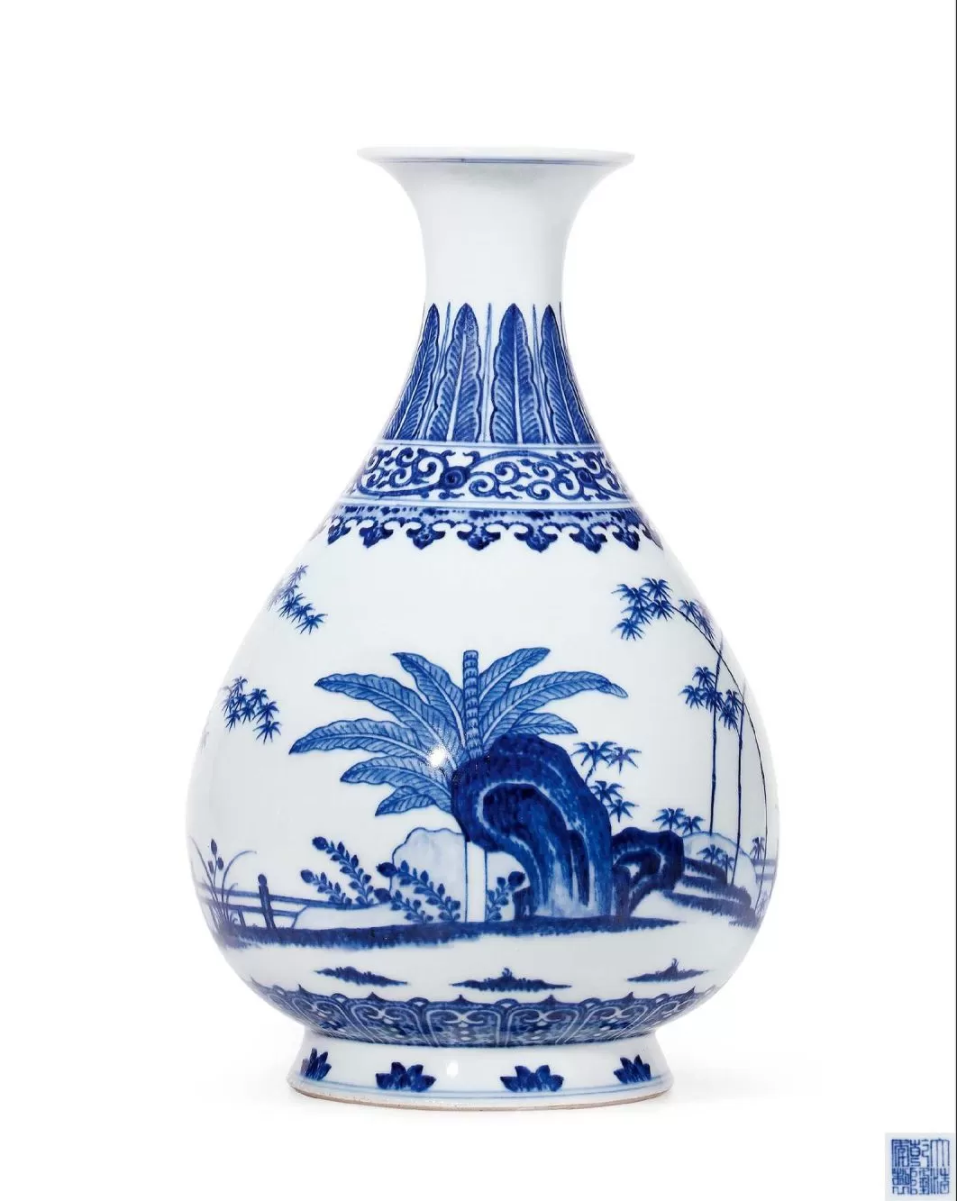 玉壶春瓶又叫玉壶春壶,是宋代创制的一种瓶式,由宋人诗句中「玉壶先春」一词而得名。玉壶春瓶初期为酒器使用,后因器形秀美,线条匀称,逐渐作为陈设之用,历代相沿,盛行不衰。竹石芭蕉纹是古代文人绘画的习见题材,寓以高雅清玄之意。明永乐时期,竹石芭蕉图开始作为玉壶春瓶装饰,(参见《故宫博物院藏明初青花瓷》上册,页44、45,图18),其后成为官窑传统品种,清代各朝均有烧制,尤以乾隆时期制品最为精丽。