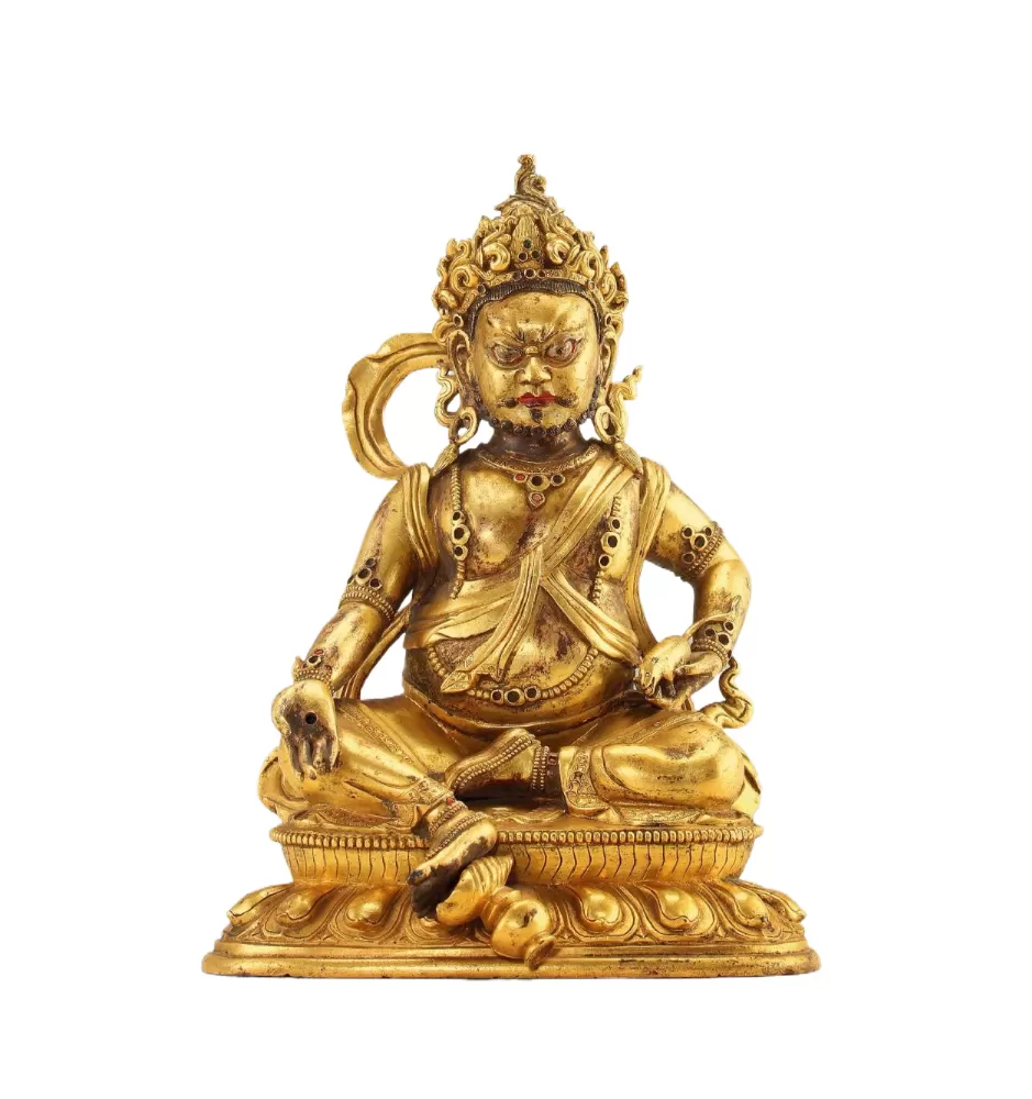 说明:铜鎏金黄财神高18厘米,头戴宝冠,坦胸露腹,肚子圆鼓略大,面庞方阔,浓眉微蹙,双目圆睁。身着天衣绸裙,佩戴璎珞钏环。左手持吐宝鼠,鼠嘴含着宝珠,象征财宝;右手结期玤印,胸前挂念珠,左足屈,右足踩着海螺宝,象征他能入海取宝。呈如意坐姿,坐在莲花宝座中央。整体造型完整,线条自然流畅。