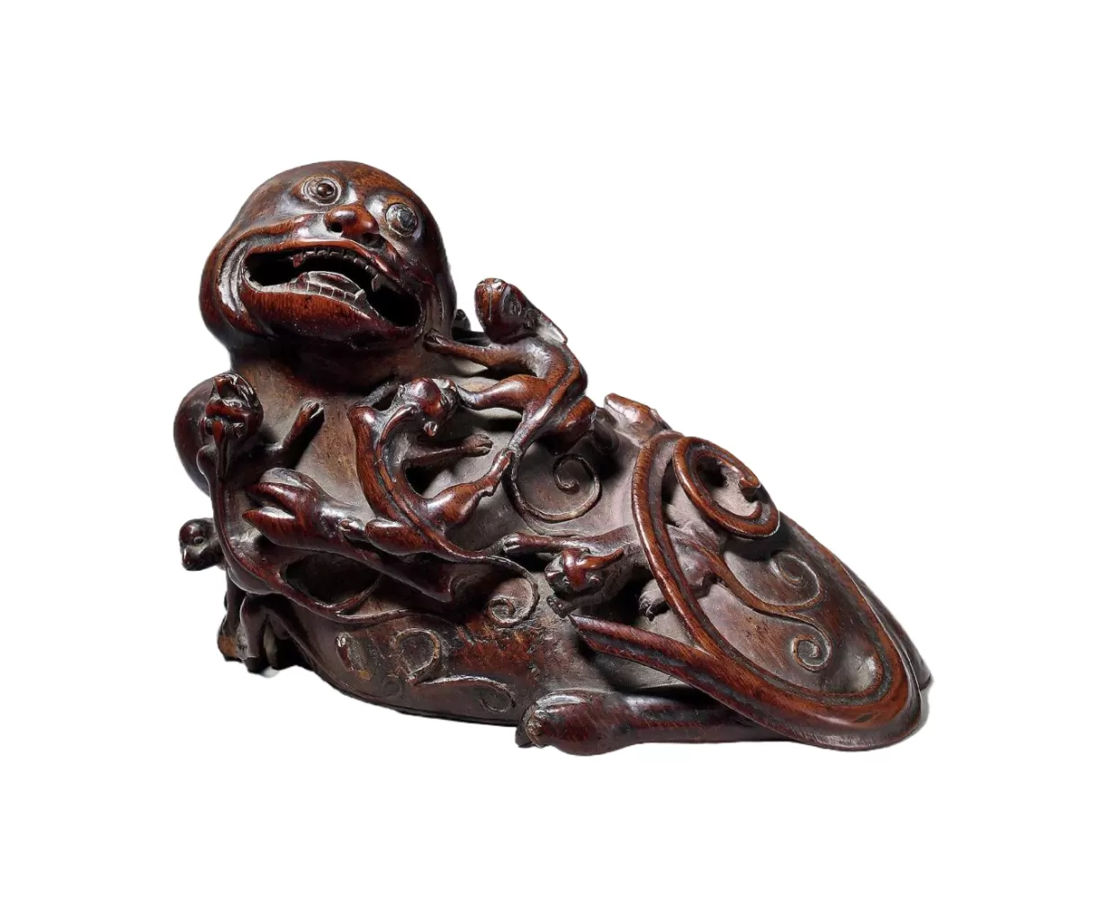 说明:该摆件由竹根雕制而成,色泽深沈,呈暗棕色,瑞兽背上趴着九只螭龙,生动活泼。全器雕刻技法娴熟,所刻画的瑞兽俯身向后扭头,咧着大嘴露出锋利牙齿,大鼻,大眼圆睁,显示出喜态,似在与螭龙嬉戏游玩,十分开怀舒畅。整体造型繁缛精致,可见雕工技艺的高超。