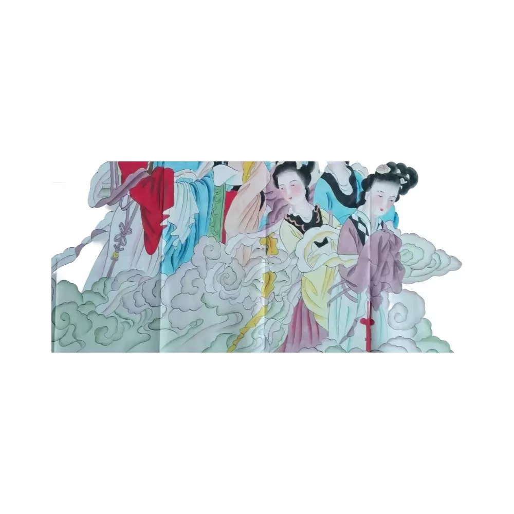 《七仙女思凡》取材于中国古代道教神话传说,讲述七位仙女厌倦天庭的清冷孤寂,向往人间烟火与凡尘情爱,结伴下凡的动人故事。这一题材在民间流传甚广,承载着人们对自由爱情、美好生活的向往,也蕴含着 “仙凡殊途” 的哲学思考。