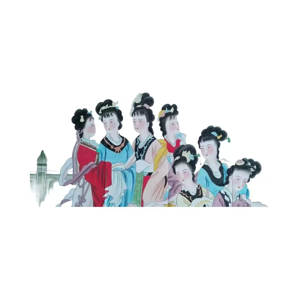画面主体为七位仙女,她们错落排布于画面中央,形成视觉焦点。七位仙女的姿态各异,或并肩而立,或侧身回眸,或低头浅笑,通过姿态的变化打破了画面的呆板,展现出灵动的韵律感。仙女周围以祥云环绕,祥云以淡墨轻染,线条柔和,既填补了画面空白,又为仙女增添了仙韵,使画面主体与背景自然衔接。