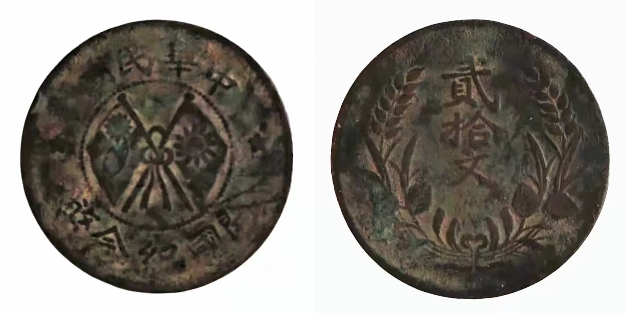 当指尖抚过这两枚饱经沧桑的民国双旗铜币,历史的温度便顺着斑驳的包浆缓缓流淌。一枚是中华民国开国纪念币贰拾文(甘肃版),一枚是中华民国开国纪念币十文(通用版),它们封存着中国近代史上最波澜壮阔的共和篇章,是辛亥革命后民主理想与民生烟火的双重见证。