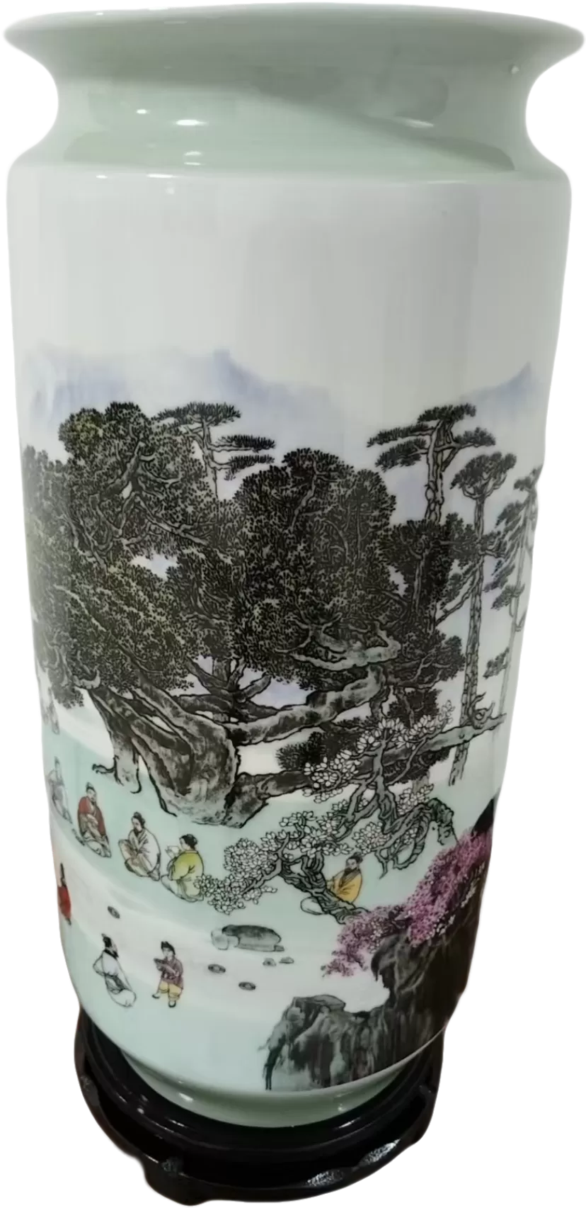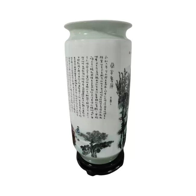 这件《兰亭修褉图》瓷瓶采用经典的筒形瓶(灯笼瓶)形制,器形端庄典雅,线条流畅圆润,既保留了传统瓷瓶的稳重感,又不失灵动之气。瓶高约 40 厘米,口径适中,瓶身微微收腰,底部承以墨色木座,整体比例协调,视觉上给人以 “亭亭玉立” 之感,完美契合了文人雅士追求的 “中和之美”。
