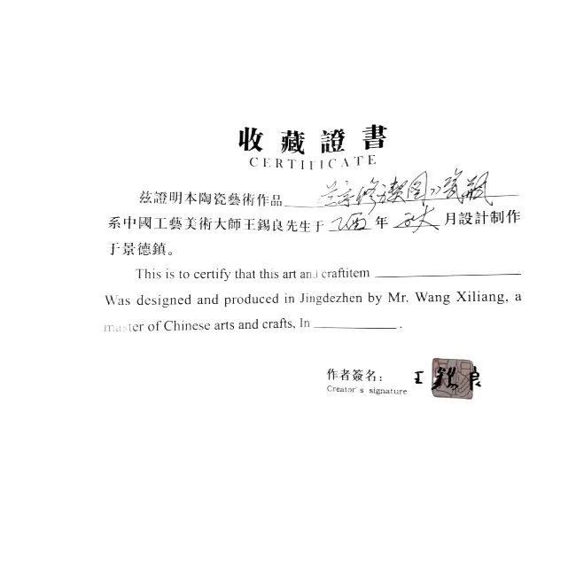 这件《兰亭修褉图》瓷瓶不仅是一件艺术珍品,更是中国当代陶瓷收藏的标杆之作。从创作背景来看,它是王锡良晚年呕心沥血之作,据收藏证书记载,作品创作于丙戌年(2006 年),历时近四年完成,期间王锡良反复修改构图、调试色彩,仅烧制环节就历经多次失败,最终才呈现出如今的完美效果,成品率不足 5%,足见其珍贵。