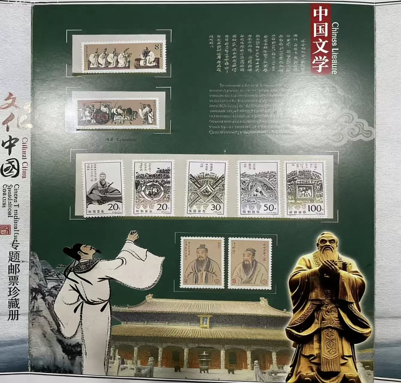 在文学板块,珍藏册完整收录了中国古典文学的巅峰之作:1994 年《中国古代文学家(第二组》邮票,串联起陶渊明、曹植、屈原、司马迁四大文学巨匠;1992 年《木兰诗》特种邮票,以四枚连印还原《木兰辞》的家国情怀;更有多组《水浒传》《三国演义》特种邮票,用国画工笔再现武松打虎、三顾茅庐等经典桥段,让四大名著的文学魅力跃然纸上。此外,1989 年《孔子诞生二千五百四十周年》