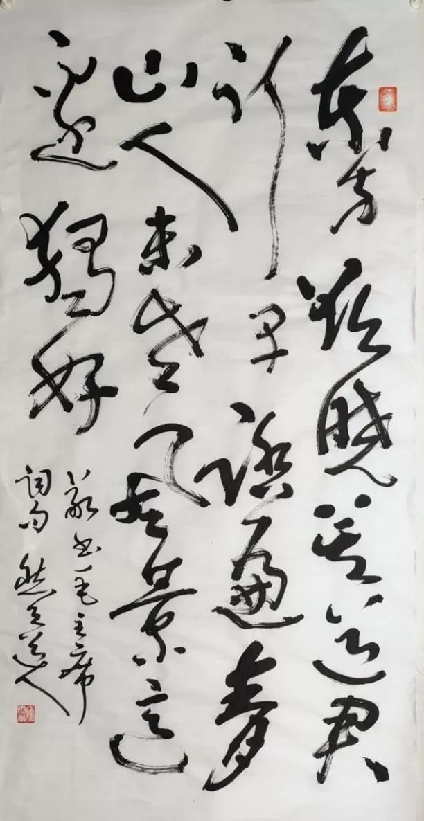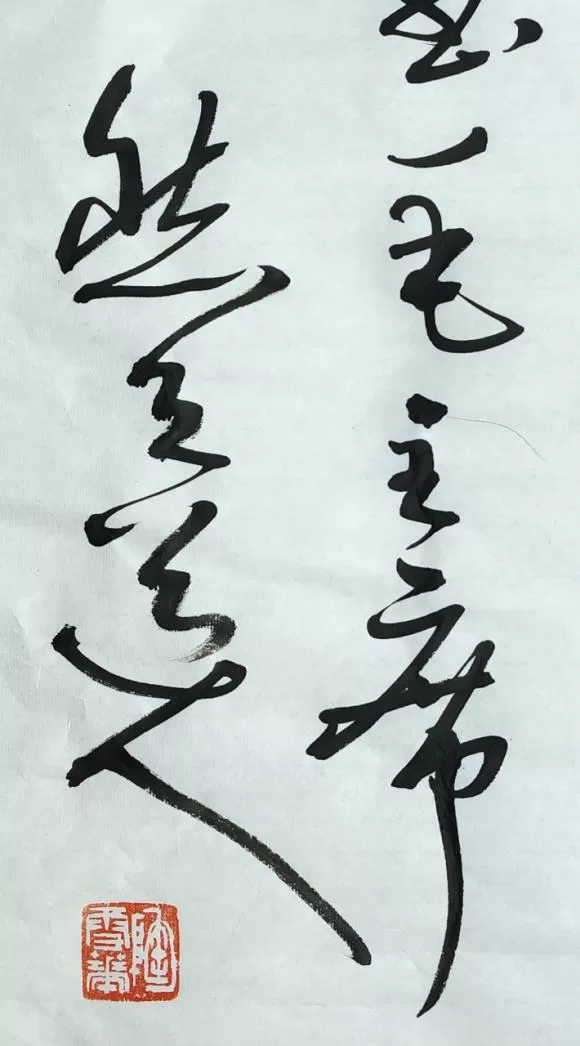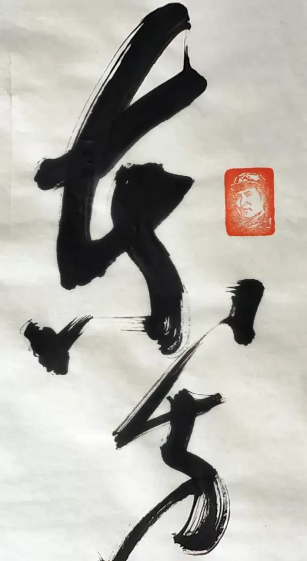 陶雪华以七十载功力,以狂草挥毫此篇,达 “书文合一” 之境。笔法:线条遒劲老辣,枯湿浓淡相生,飞白灵动、顿挫有力,融张旭之奔放、怀素之流畅与碑学之雄健。结体:字势开合跌宕、欹正相生,大小错落、疏密有致,气脉贯通。章法:布局大气磅礴,首尾呼应,开篇肖像闲章点睛,落款钤印规范,形神兼备。通篇笔墨酣畅,将词中豪迈气魄与革命激情,化为视觉交响,尽显 “碑骨帖韵、雄浑洒脱” 之风。