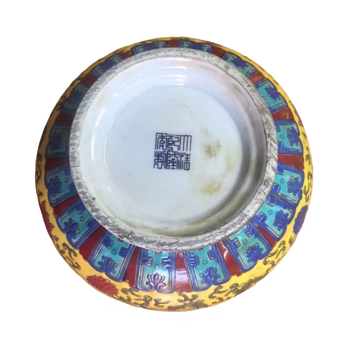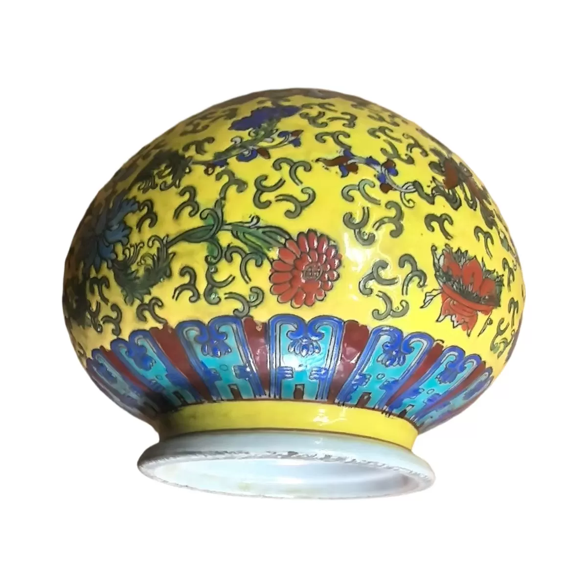 · 地色与主纹:通体以明黄釉为地,黄釉是清代皇家专属色,只有皇帝、皇后可用,民间禁用,彰显了器物的御窑身份。黄地上以粉彩满绘缠枝花卉纹,包含牡丹、莲花、菊花、宝相花等,花卉色彩丰富,粉、红、蓝、绿、金等多色晕染自然,花瓣层次分明,枝叶缠绕流畅,寓意 “富贵连绵、生生不息”。