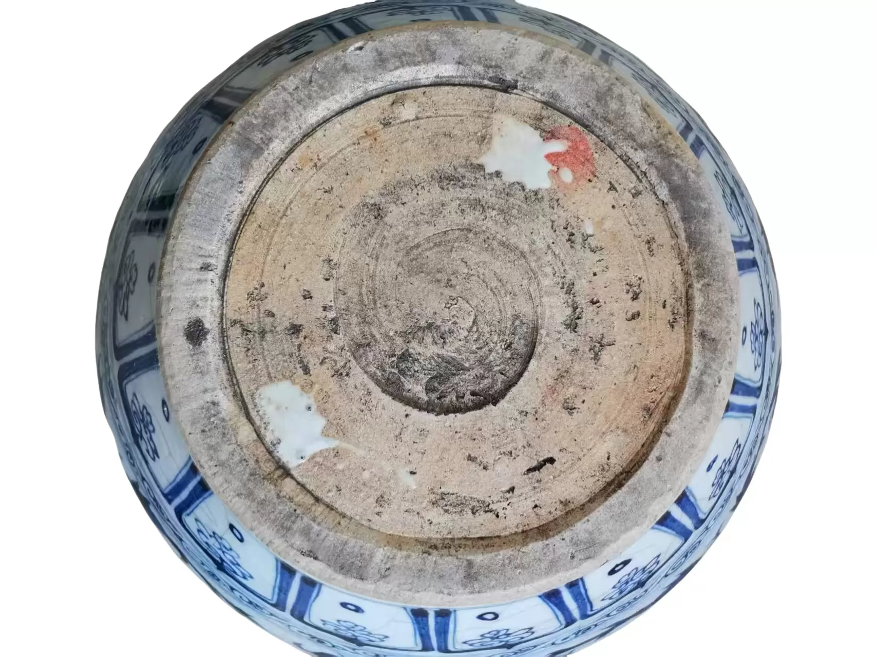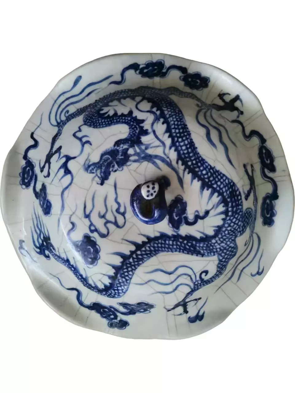 据了解,这种开片并非匠人刻意烧制,而是釉面与胎体因热胀冷缩系数不同,历经数百年岁月沉淀后自然形成的痕迹。不同于后世仿品的人工开片,这件器物的冰裂纹深浅不一,釉面在裂纹处微微沁入包浆,形成自然的 “金丝铁线” 质感,手抚上去光滑平整,没有生硬的刺手感。这些裂纹非但没有损伤器物的美感,反而为它增添了沧桑厚重的气质,让青花的明艳在冰裂纹的映衬下,多了几分沉静与内敛。