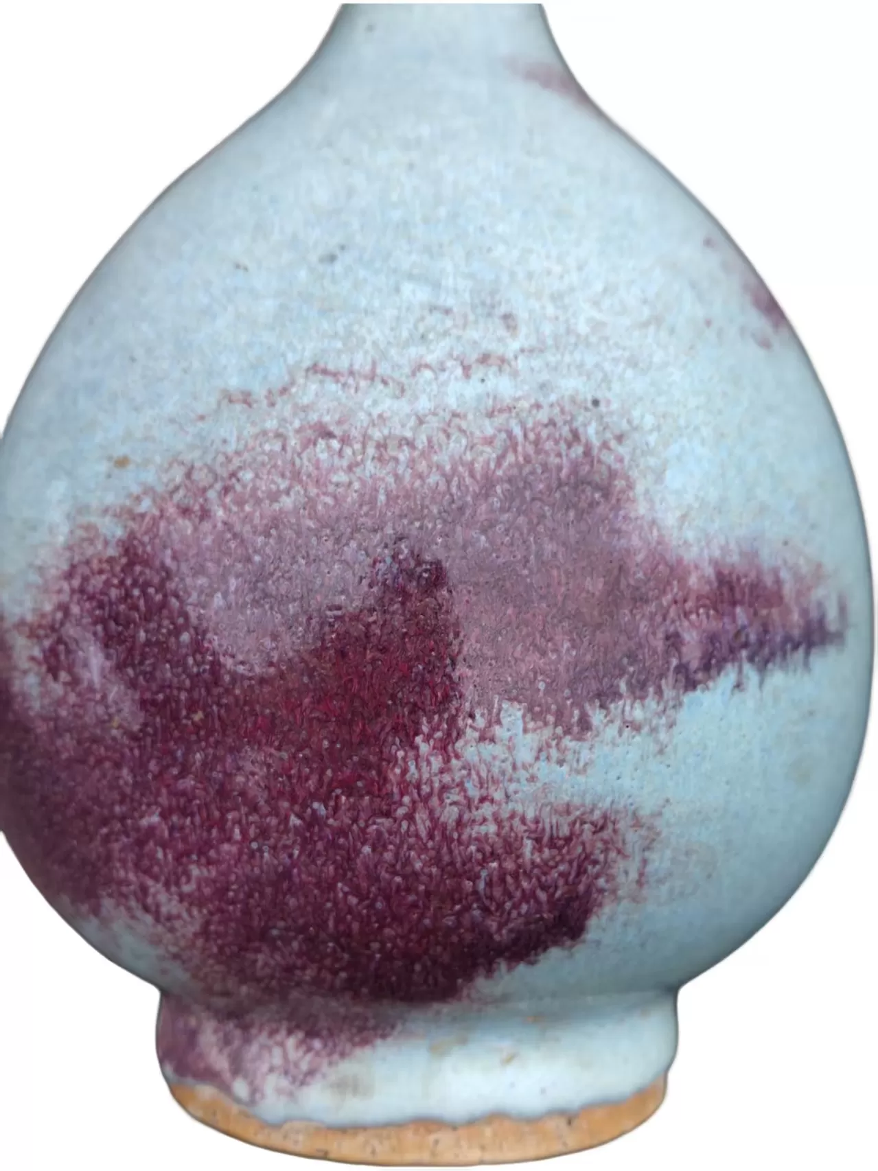 胎底自然老化、磨损痕迹清晰,无做旧、无修补,历经数百年流传,品相完整、无冲无裂、釉色如新,在金元钧瓷中实属罕见 —— 金元战乱频繁、窑口烧造时间短、存世量本就稀少,完整器不足百件,带精美紫斑的玉壶春瓶更是屈指可数,稀缺性冠绝同类。