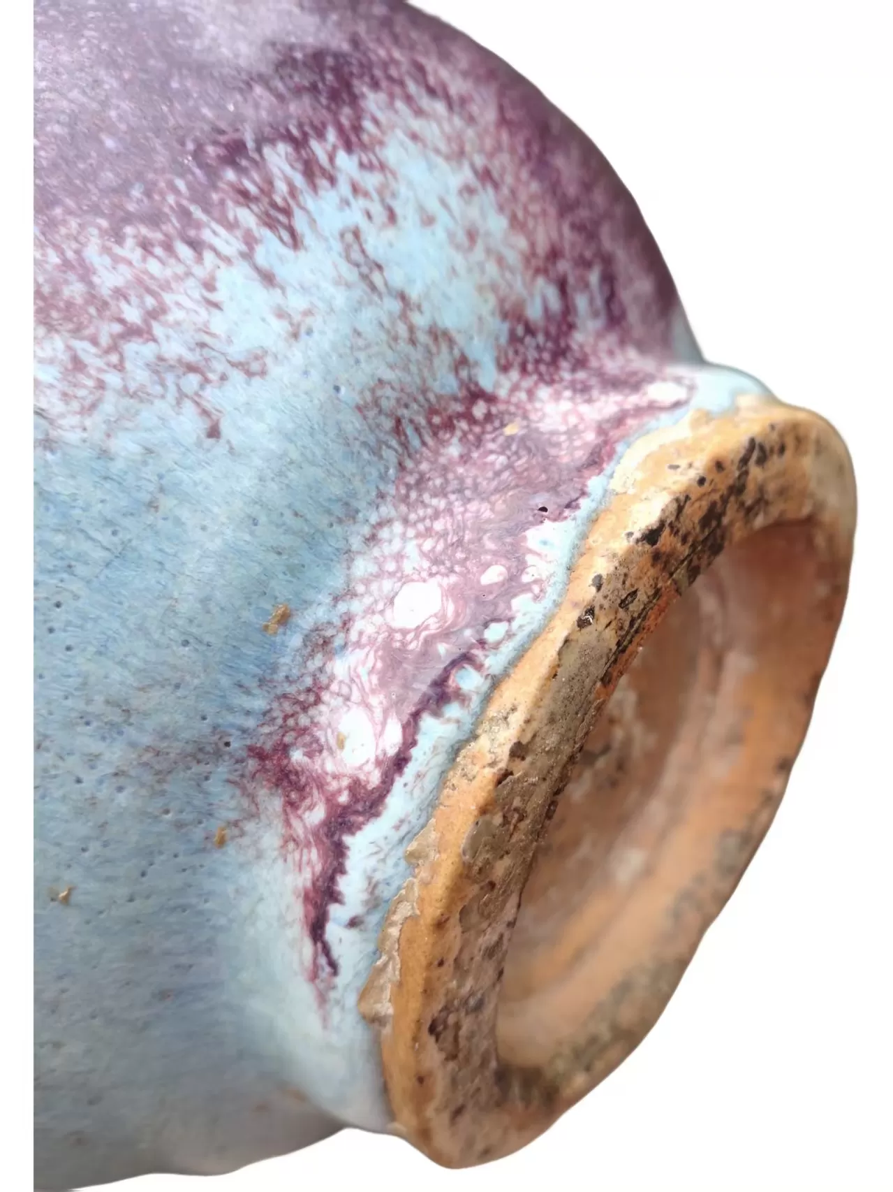 腹部自然晕散玫瑰紫窑变斑,紫斑浓淡相宜、边缘晕散自然,与天蓝釉色交融渗透、层次丰富,无人工描饰痕迹,是窑火中铜元素在还原焰下自然窑变的天工奇迹 ——“钧窑见红,价值连城”,金元时期能烧出如此匀净天蓝、紫斑瑰丽的完整器,概率不足千分之一,每一件紫斑钧瓷都是独一无二的孤品。