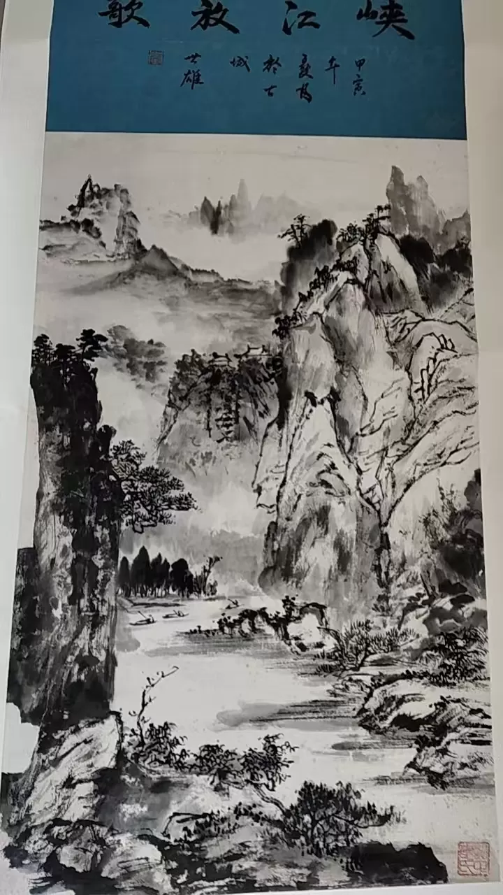 本作《峡江放歌》,集中展现了李世雄先生炉火纯青的山水造诣。画作题头 “峡江放歌” 四字笔力遒劲、气韵开张,落款 “甲寅年夏月写于古城 世雄”,搭配制式规整的篆刻印章,诗、书、画、印四艺合一,是标准完整的传统文人画形制。