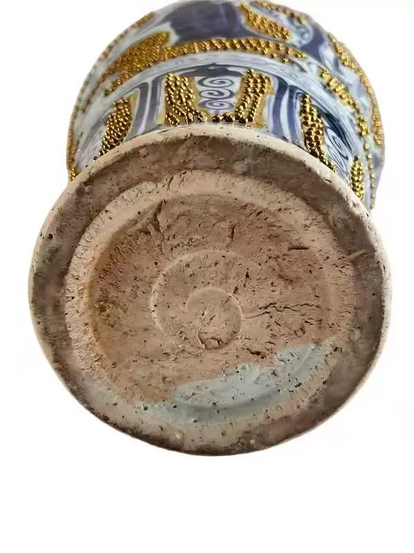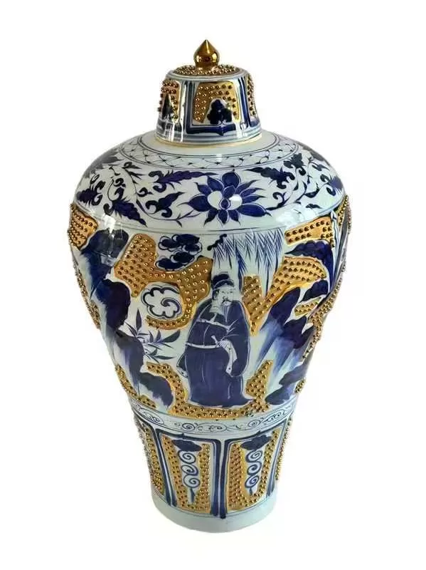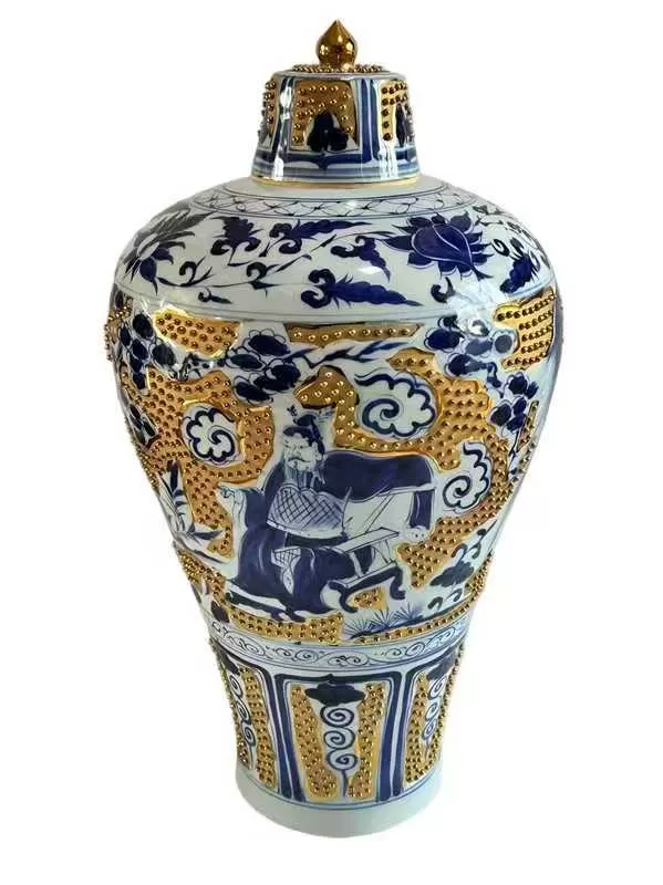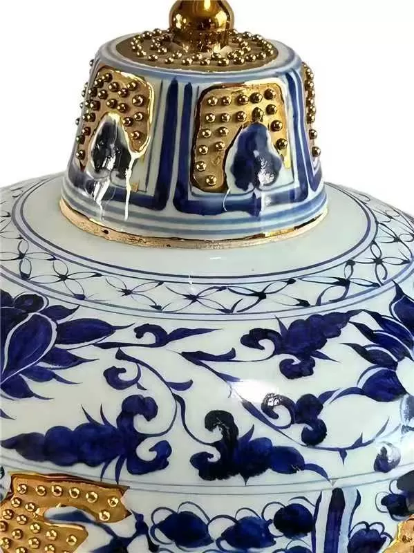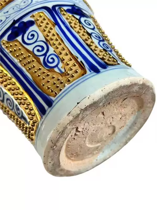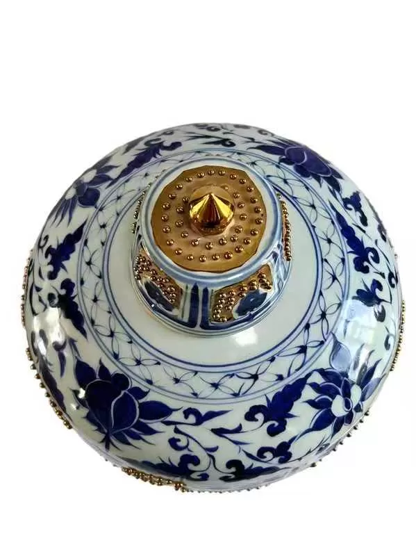 素雅沉静的青花冷色调,与黄金的温润华贵暖色调形成极致视觉反差,传统青花的古雅含蓄,碰撞描金鼓钉的华丽张扬,既保留了千年青花的东方古韵,又增添了极强的奢华氛围感与立体装饰效果,工艺复杂度、制作难度远超普通平面青花瓷器,手工价值与工艺溢价大幅提升。
