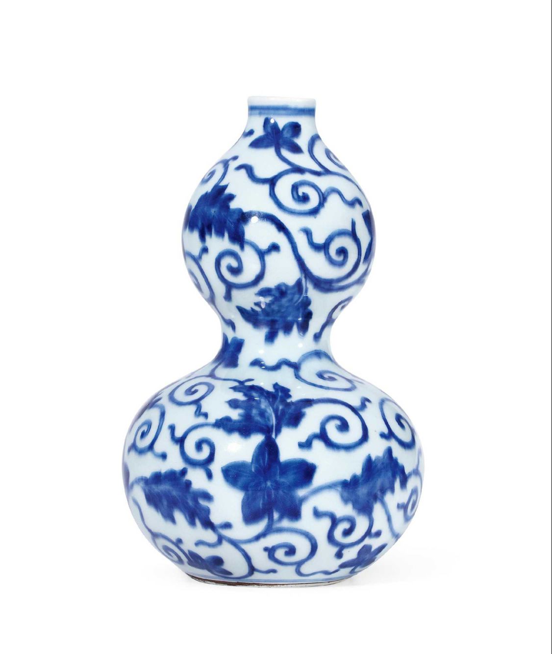 作为众多吉祥寓意的载体,葫芦型器物深受历朝历代帝王所垂青。此件清康熙青花缠枝花卉纹葫芦瓶,拟取天然葫芦之形态,小直口,束腰,双球腹,平底,造型端庄别致。通体青花装饰,瓶身以翠蓝色青花绘缠枝藤蔓葫芦花果纹,画意古朴自然,线条简洁流畅,布局疏密得当,绘工柔美雅致。青花发色纯正妍丽,有深浅色阶,纹饰新颖,葫芦枝蔓萦绕勾连,纹饰饱满清晰,画工殊为精妙,独具风韵。康雍时期,许多宫廷内器摹明初之风骨,此件葫芦瓶纹饰便颇具明初绘画装饰风格,若比较明初期与中晚期此制式葫芦瓶的制作,可见此件康熙朝慕古产品,无论纹饰、画风、器型、修胎制式与明代名品同出一辙。由此可见,此件葫芦瓶实为康熙御窑下的拜古之作。