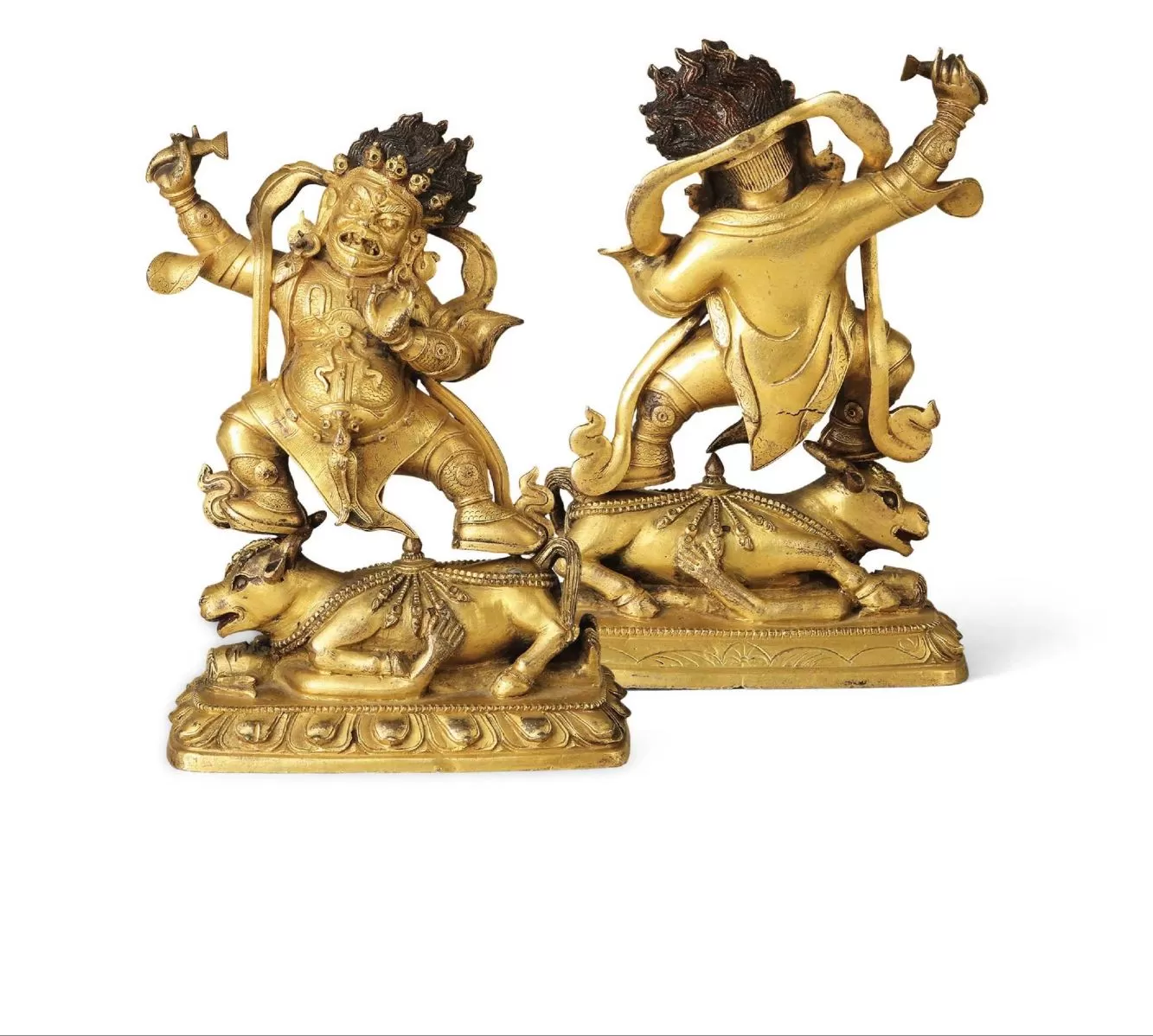汉藏风格,铜鎏金大红司命主,又名战神、皮恺甲、大红大黑天,藏语称为“滚波斯仁”,是喇嘛教里特有的五守舍神之一,直译为“敌神”,其主要职能是佑护崇拜者不为外敌所伤,是居于人右肩之上的神灵。大红司命主头带骷髅宝冠,火焰状怒发飘于脑后,三目圆睁,表情凶愤。右手高举宝剑,左手当胸结期克印,身着金光闪闪的铠甲,姿态威武彪悍,有威振寰宇之势。