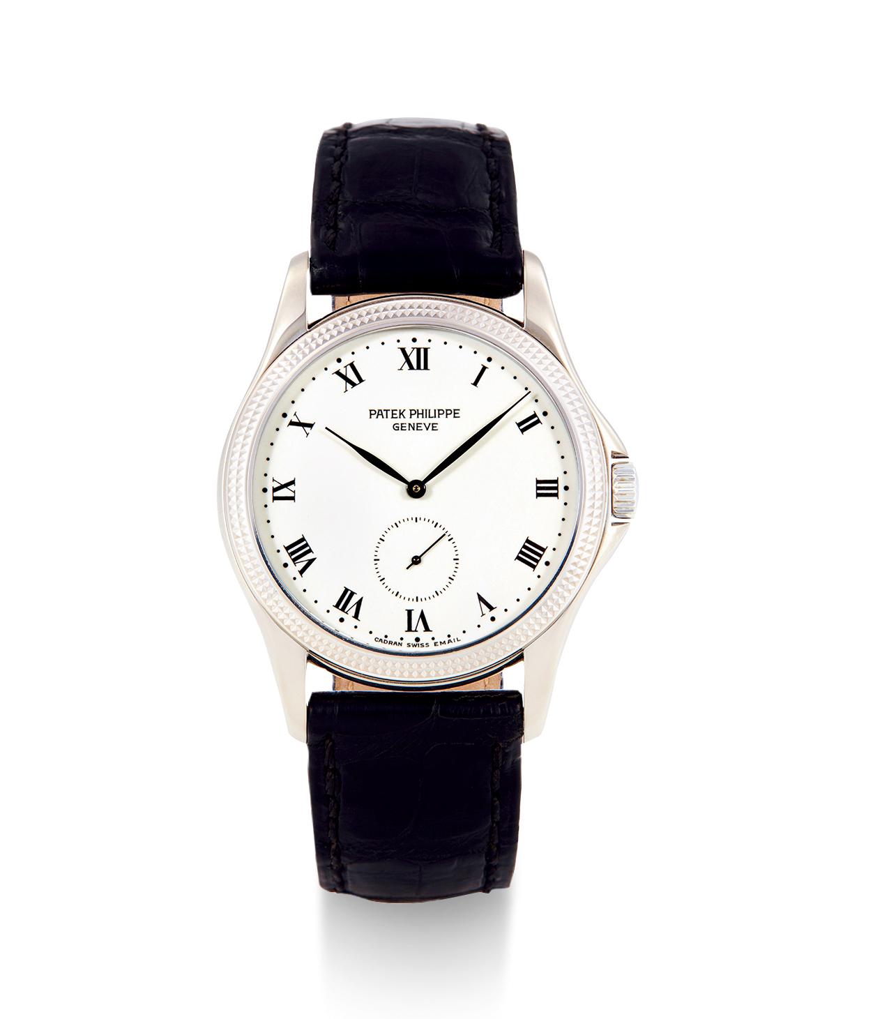 215型机芯,18颗宝石,5方位温差调校;珐琅表盘,银色指针,小秒盘,罗马数字时标;18K白金表壳及底盖,巴黎钉纹精雕表圈,蓝宝石镜片;机芯和表盘有品牌印记,18K白金标准穿孔式带扣,原装表带