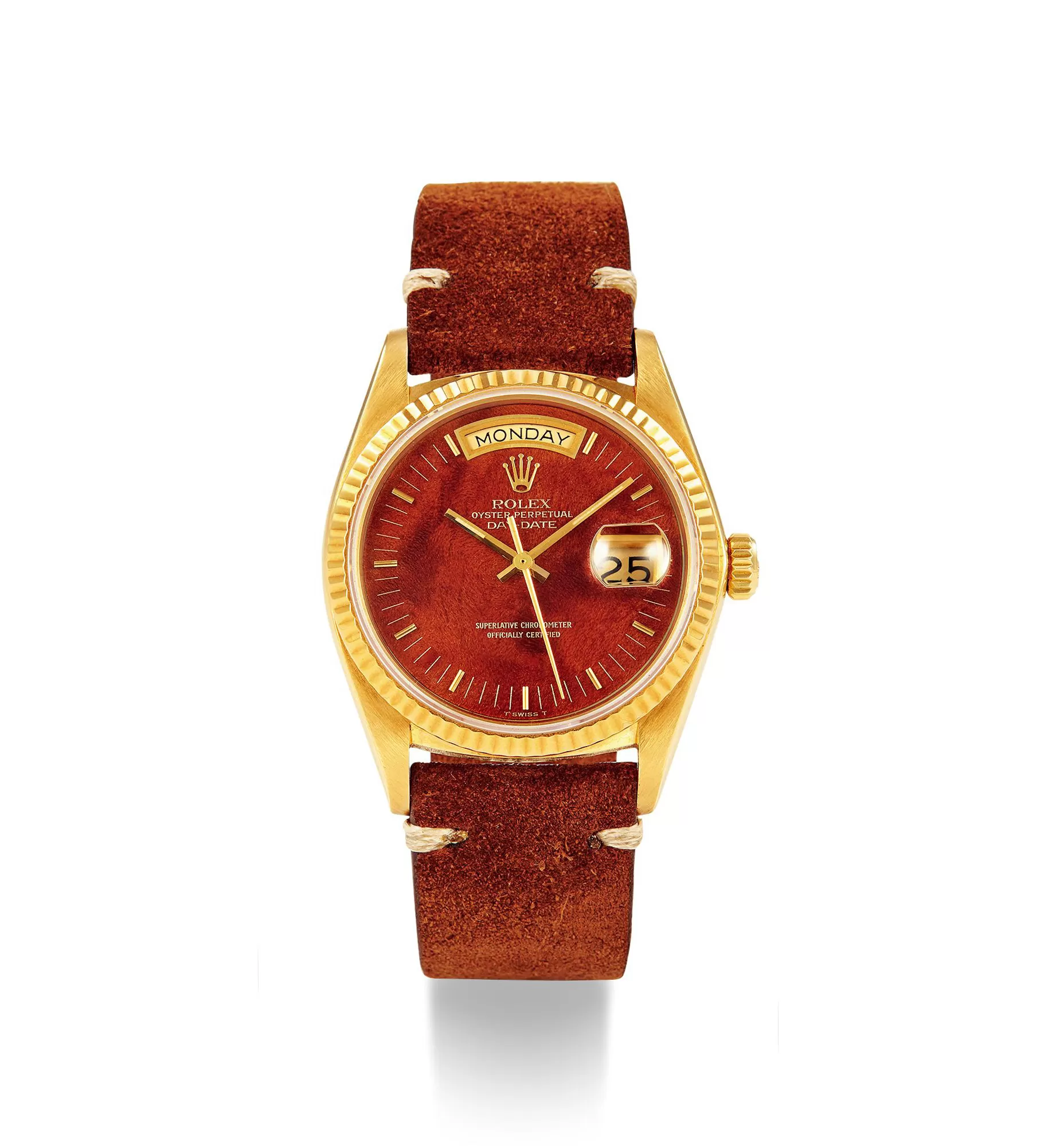 自动上弦机芯;木盘表盘,金色指针及立体时标;防反光凸透式放大日历窗,星期显示;18K黄金表壳及底盖,蓝宝石镜片;表盘和表冠有品牌印记,18K金标准穿孔式带扣