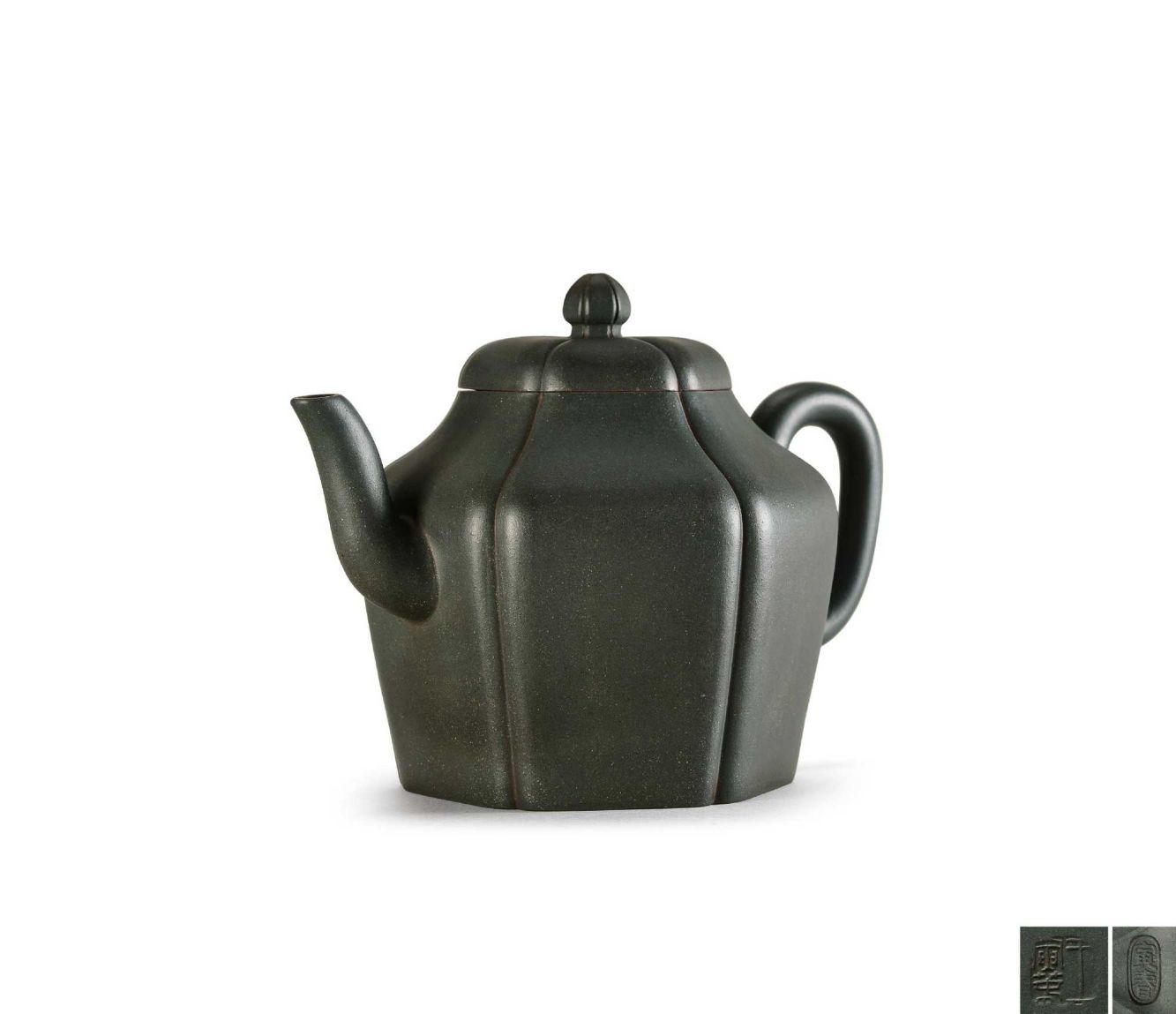 此壶绿泥而制,形制取梅瓣造型,全器由六片筋纹从壶钮到壶底,弯曲扭转,一气呵成,线条挺拔流畅,六瓣梅花饱满丰腴,气度极佳。制作精良、严谨,器型圆润、饱满,转折过渡处理自然老练。壶嘴与壶把、壶身紧密呼应,嘴把上扬舒展,且比例恰到好处,甚见功力。筋纹式壶钮如待放含苞,具画龙点睛之妙。壶盖与壶身扣合严密,可见对泥料特性和烧造时间了然于胸。壶盖有“寅春”楷书款,底部钤“王寅春”三字篆书款。“寅春”款是王氏的一个标志,常于盖内或壶内口沿钤之。“王寅春”印为王寅春好友潘稚亮所刻。1936年王寅春结识了著名金石书法家潘稚亮,潘刻章相赠。王寅春宝爱此印,终其后半生一直用之铃于壶底,从未更换。