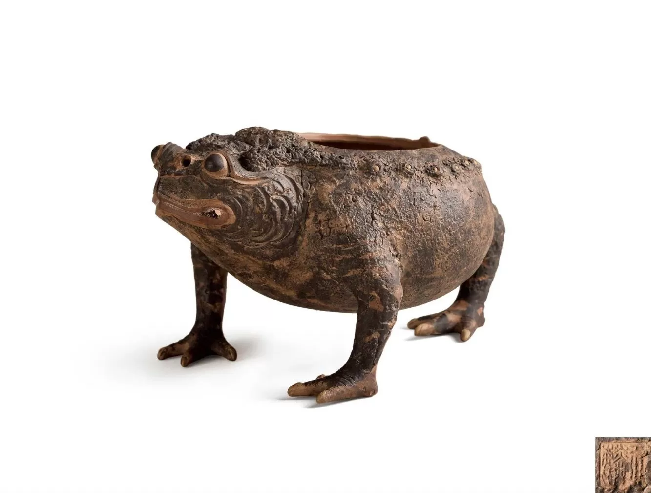 此件菖蒲盆设计别出心裁,采用段泥仿生三足金蟾而制。金蟾双目突出,阔口,两前肢撑地,一后腿侧向一边。通体斑驳不平,辅以黑色点缀,营造出蛤蟆皮肤的质感,写实逼真。金蟾身体中空,背部为口,与仰绍文化陶鸮鼎异曲同工。右前腿上方,有篆书“玉麟”印款,即紫砂名家黄玉麟。整件虽为仿生器,却并非生搬描摹,其形态夸张,技法率性,浑然天成。