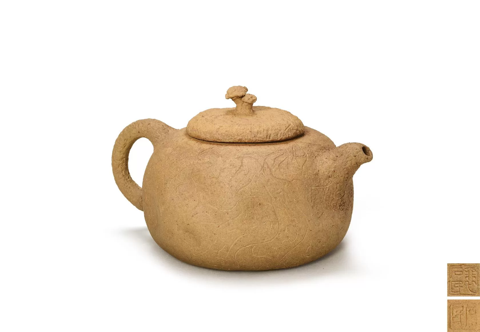 此件供春壶以精选段泥制成,造型似树瘿,取短蒂为盖,壶身通体纹理缭绕,形如老树疙瘩,瘿瘤满布,枝梗做柄。朴质轻巧,握把舒适,出水流畅。供春是明代制壶大师,清人推其为紫砂鼻祖,吴梅鼎《阳羡茗壶赋》中以“彼新奇兮万变,师造化兮元功。信陶壶之鼻祖,亦天下之良工”赞颂供春壶的大雅之美。周澍《台阳百咏》则有“最重供春小壶,一具用数十年,则值金一笏”之说,感叹泥砂制器与黄金等值。供春壶款式不一,尤以树瘿壶最为世所珍重,因此这类树瘿壶又称为供春壶。